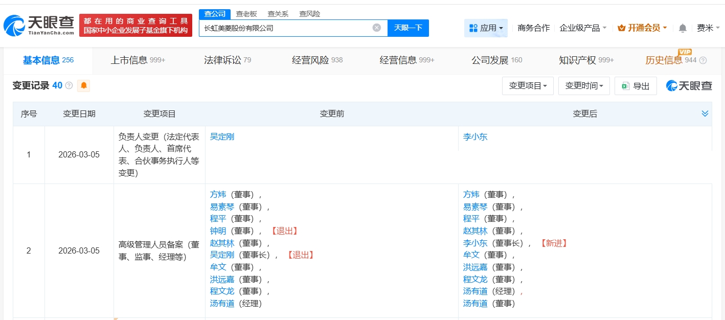 天眼查App显示,近日,长虹美菱(000521)发生工商变更,吴定刚卸任法定代表人、董事长,由李小东接任。同时,部分高管发生变更。