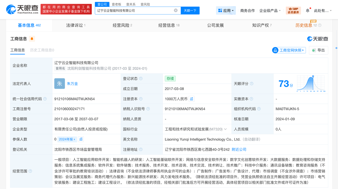 天眼查App显示,遭315晚会曝光的辽宁云企智能科技有限公司成立于2017年3月,法定代表人为朱万金,注册资本1000万人民币。经营风险信息显示,2025年3月16日,该公司因通过登记的住所或者经营场所无法联系,被沈阳市铁西区市场监督管理局列入经营异常名录,此外,2025年4月,该公司新增一则注销备案公告,注销原因为决议解散。