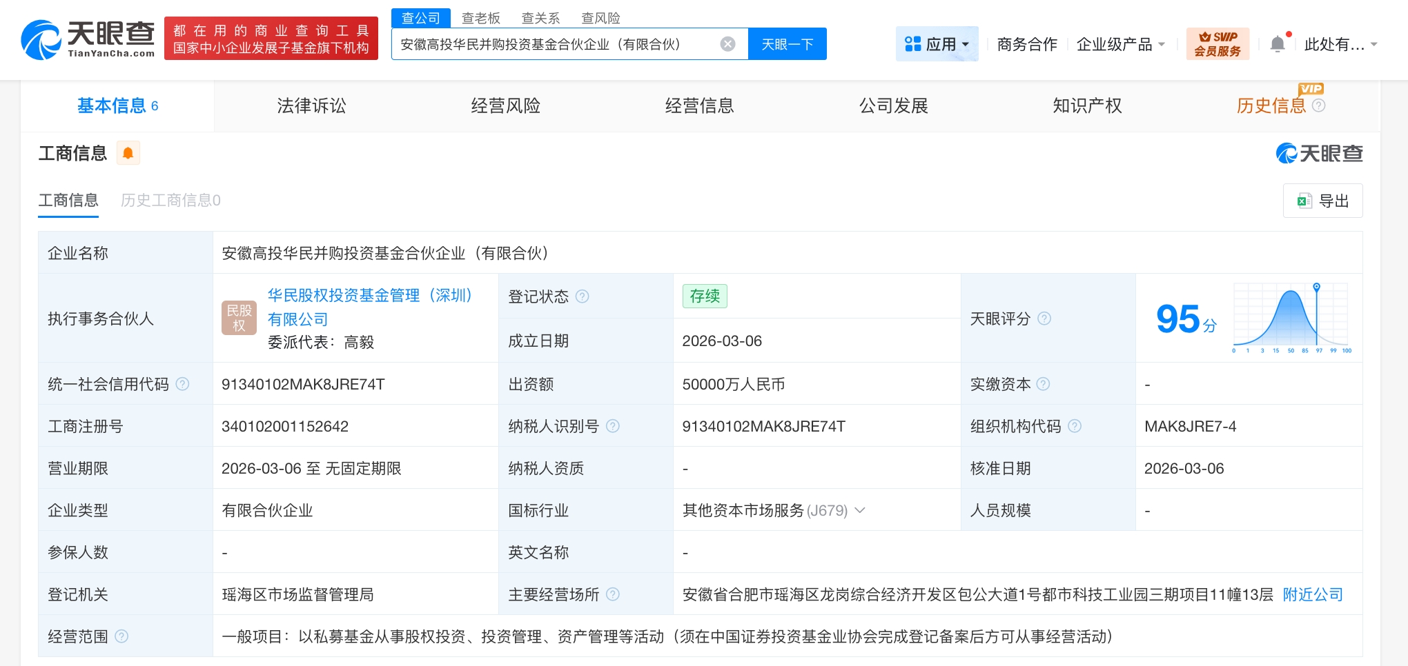 天眼查工商信息显示,近日,安徽高投华民并购投资基金合伙企业(有限合伙)成立,执行事务合伙人为华民股权投资基金管理(深圳)有限公司,出资额5亿人民币,经营范围为以私募基金从事股权投资、投资管理、资产管理等活动。合伙人信息显示,该基金由连云港高新股权投资合伙企业(有限合伙)、连云港润海股权投资基金合伙企业(有限合伙)、安徽省三重一创产业发展二期基金有限公司等共同出资。