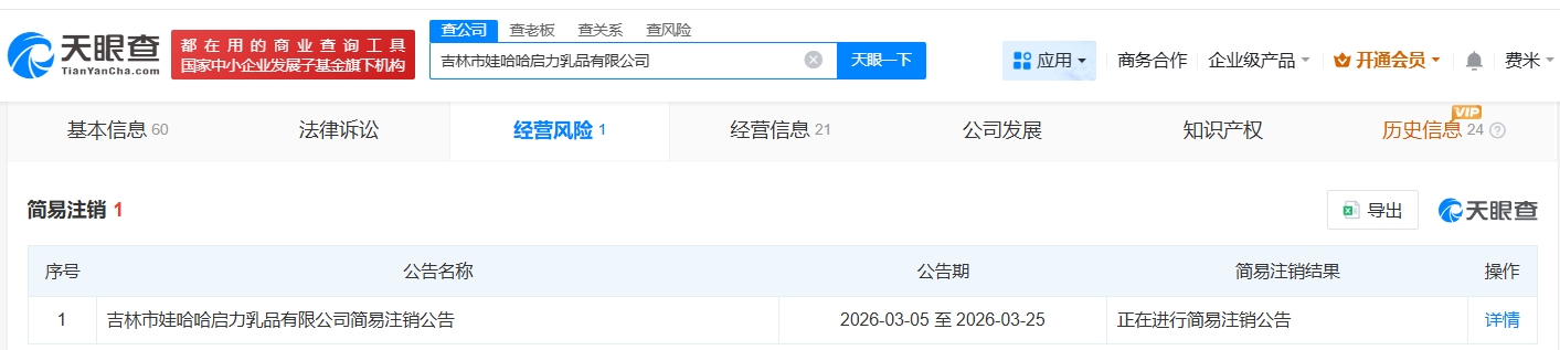 天眼查经营风险信息显示,近日,吉林市娃哈哈启力乳品有限公司新增一则简易注销公告,公告期为3月5日至3月25日。