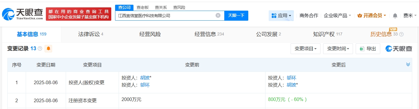 天眼查App显示,涉事公司江西宜信堂医疗科技有限公司成立于2010年11月,法定代表人为胡波,经营范围包括第二类医疗器械生产、第三类医疗器械租赁、第三类医疗器械经营等。股东信息显示,该公司由胡波、邬环共同持股。变更记录显示,去年8月,该公司注册资本由2000万人民币减至800万人民币。