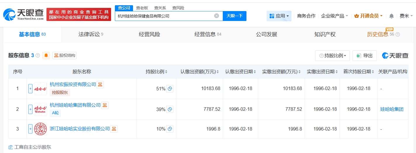 杭州娃哈哈保健食品有限公司成立于1996年2月,注册资本约2亿人民币,经营范围包括食品销售、农副产品销售、食品添加剂销售等。股东信息显示,该公司由杭州宏振投资有限公司、杭州娃哈哈集团有限公司、浙江娃哈哈实业股份有限公司共同持股。