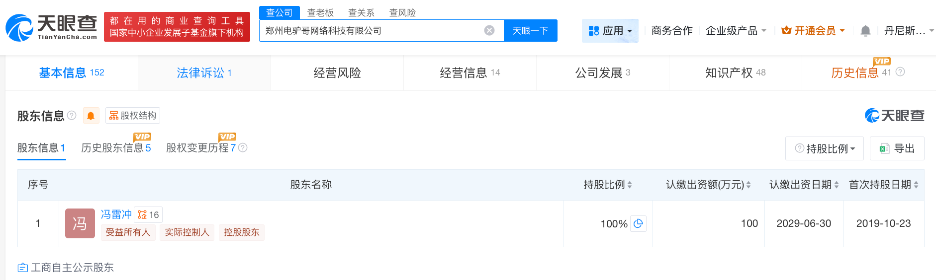 天眼查App显示,郑州电驴哥网络科技有限公司成立于2018年12月,法定代表人为冯雷冲,注册资本100万人民币,经营范围包括网络与信息安全软件开发、计算机系统服务、信息安全设备销售、电子产品销售、软件开发等,由冯雷冲全资持股。值得一提的是,冯雷冲持股的杭州找电驴投资管理合伙企业(有限合伙)被多次列入经营异常名录。