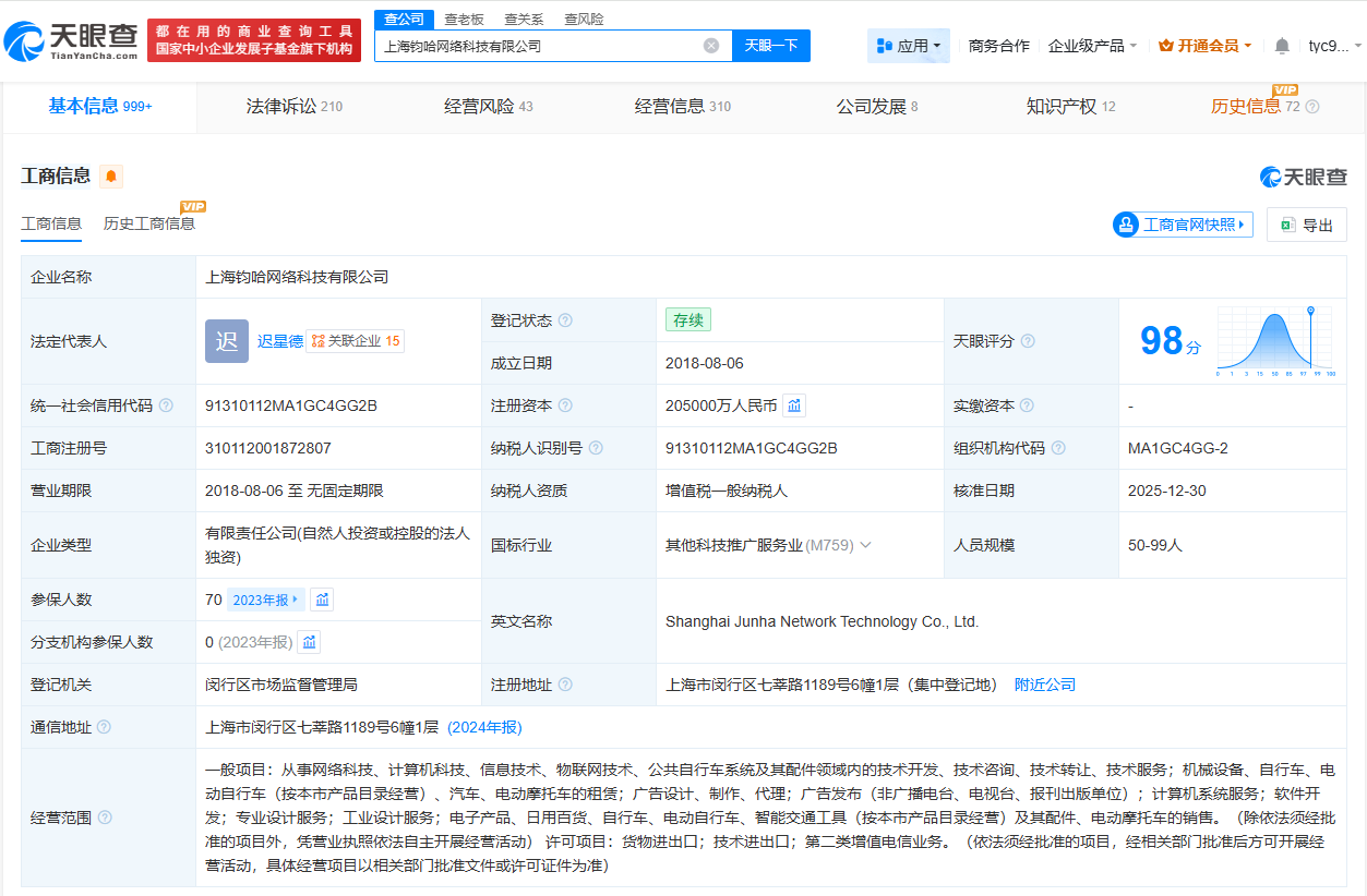 天眼查App显示,“哈啰租电动车”关联公司上海钧哈网络科技有限公司成立于2018年8月,法定代表人为迟星德,注册资本20.5亿人民币,经营范围包括机械设备、自行车、电动自行车、汽车、电动摩托车的租赁等,由哈啰出行关联公司上海钧丰网络科技有限公司全资持股。分支机构信息显示,该公司现存8家分公司,其中5家已注销。行政处罚信息显示,该公司现存多条行政处罚信息,处罚事由包括以不合格产品冒充合格产品等,处罚单位包括上海市闵行区市场监督管理局、上海市浦东新区三林镇人民政府等。