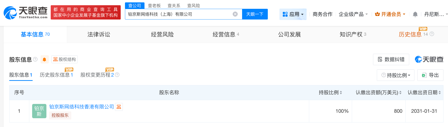 天眼查App显示,“畅派出行”关联公司铂京斯网络科技(上海)有限公司成立于2023年11月,法定代表人为冯玉萍,注册资本800万美元,经营范围包括软件外包服务、信息技术咨询服务、数据处理服务、软件销售等,由铂京斯网络科技香港有限公司全资持股。变更记录显示,今年2月,该公司发生工商变更,注册资本由250万美元增至800万美元,增幅220%。对外投资信息显示,该公司直接持股19家企业,其中18家为存续状态,包括铂京斯(上海)新能源有限公司、铂京斯(杭州)新能源有限公司等,子公司分布在杭州、长沙、深圳、重庆、济南、西安等地。