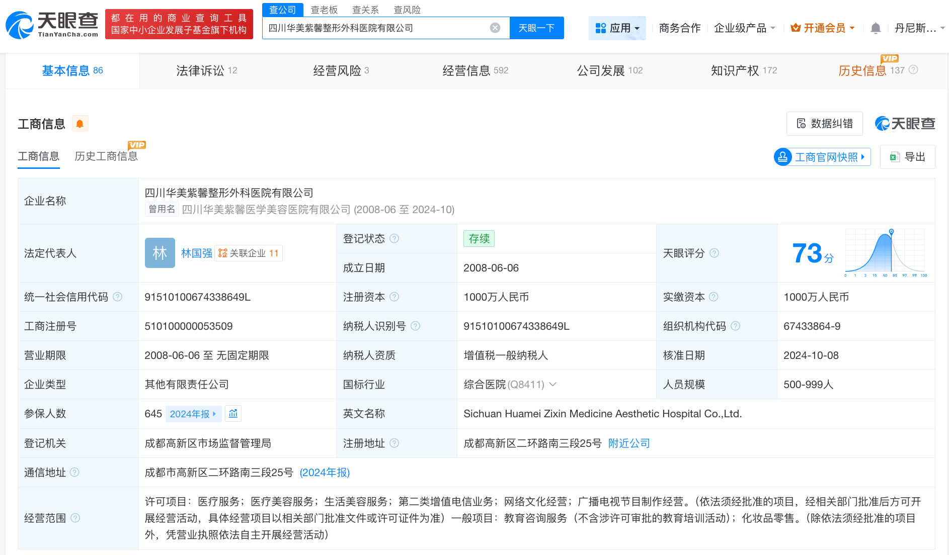 天眼查App显示,四川华美紫馨整形外科医院有限公司成立于2008年6月,法定代表人为林国强,注册资本1000万人民币,经营范围包括医疗服务、医疗美容服务、生活美容服务、第二类增值电信业务等,由美莱医学美容集团有限公司、厦门华医馆投资有限公司等共同持股。天眼风险信息显示,2025年10月,该公司因广告中出现违规内容,被成都高新区市场监督管理局罚款,此外,2024年10月,该公司因违反《广告法》相关规定,被四川省市场监督管理局罚款3万元。
