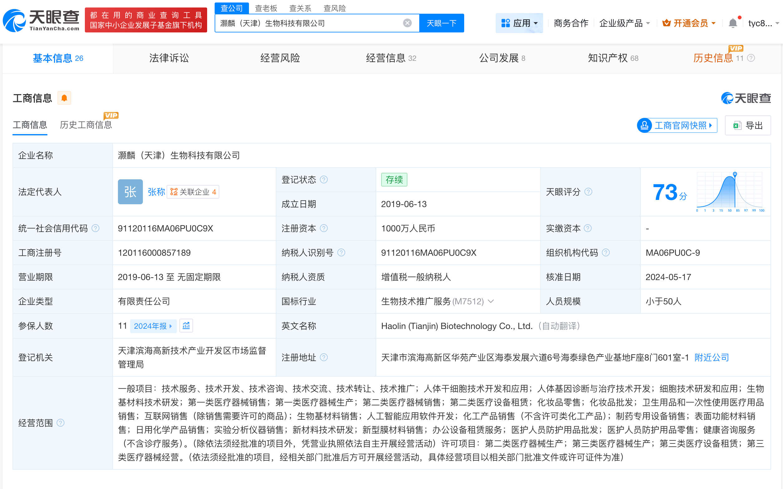 天眼查App显示,灏麟(天津)生物科技有限公司成立于2019年6月,法定代表人为张称,注册资本1000万人民币,经营范围包括人体干细胞技术开发和应用、人体基因诊断与治疗技术开发、细胞技术研发和应用等,由万智恒、张称共同持股。对外投资显示,该公司对外投资3家企业,分别为灏麟生物医药(天津)有限公司、灏麟(北京)医学技术有限公司、天津鹊名生物医学工程研究有限责任公司。知识产权信息显示,该公司已申请多个“一种人源胶原蛋白冻干装置”“一种用于肌少症诊断和评估的核磁数据优化方法”等相关专利。