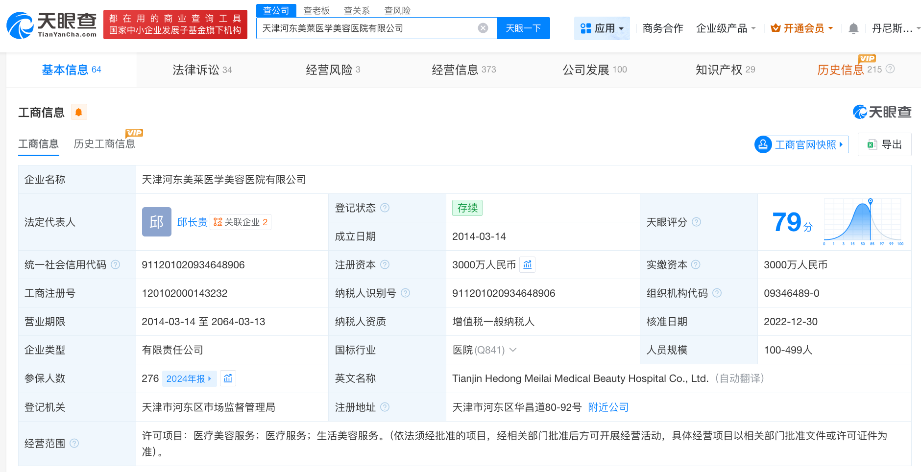 天眼查App显示,天津河东美莱医学美容医院有限公司成立于2014年3月,法定代表人为邱长贵,注册资本3000万人民币,经营范围包括医疗美容服务、医疗服务、生活美容服务,由美莱医学美容集团有限公司、厦门华医馆投资有限公司共同持股。天眼风险信息显示,该公司存在多条行政处罚信息,其中,2025年7月,该公司因违规发布广告被罚,2024年6月,该公司因未按照医疗器械适用范围使用医疗器械被罚,2021年4月,该公司因未依照规定存麻醉药品和第一类精神药品被警告。此外,该公司多次因医疗纠纷被起诉。