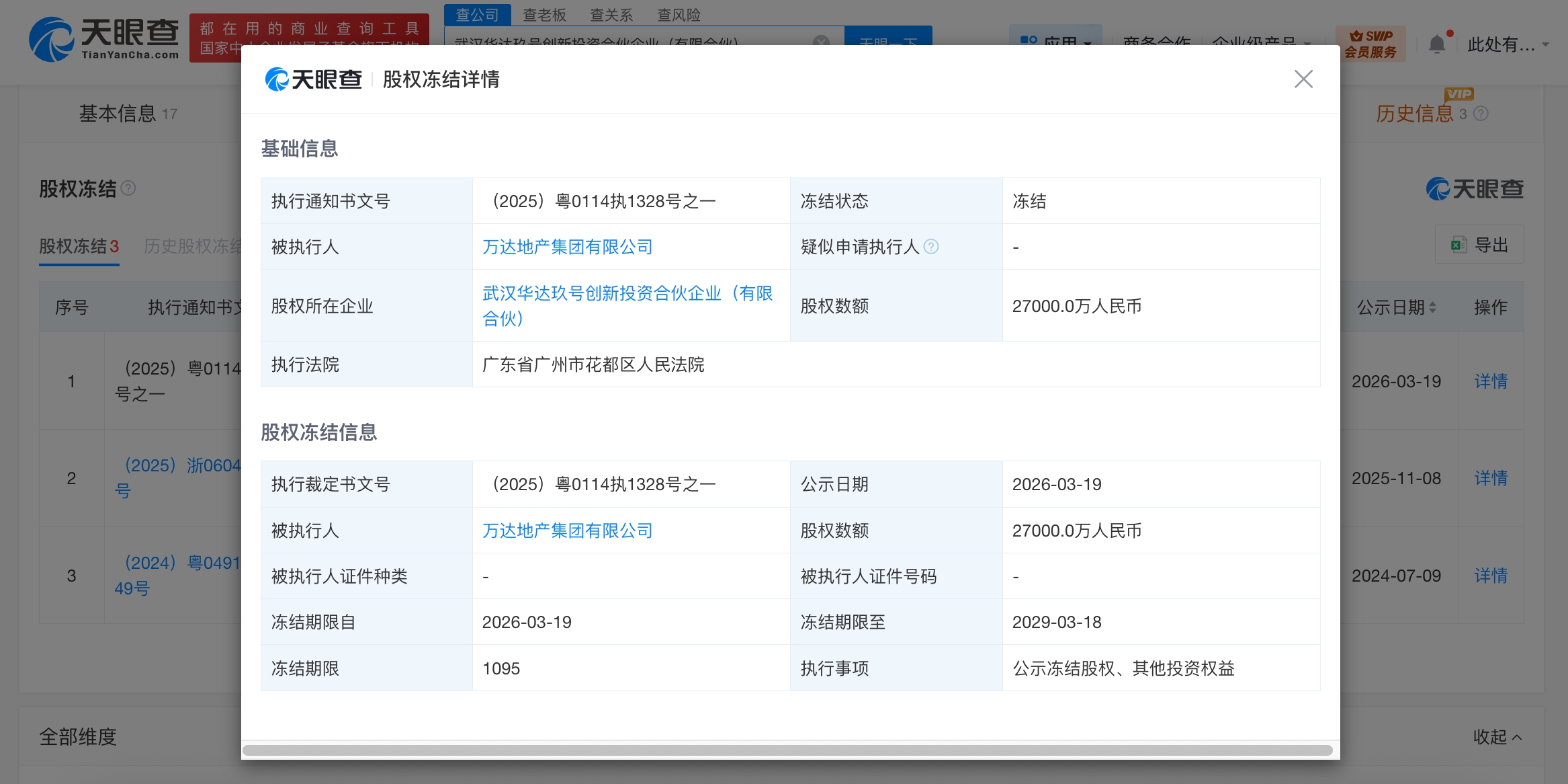 天眼查法律诉讼信息显示,近日,万达地产集团有限公司新增一则股权冻结信息,股权所在企业为武汉华达玖号创新投资合伙企业(有限合伙),冻结股权数额2.7亿元,冻结期限3年,执行法院为广东省广州市花都区人民法院。