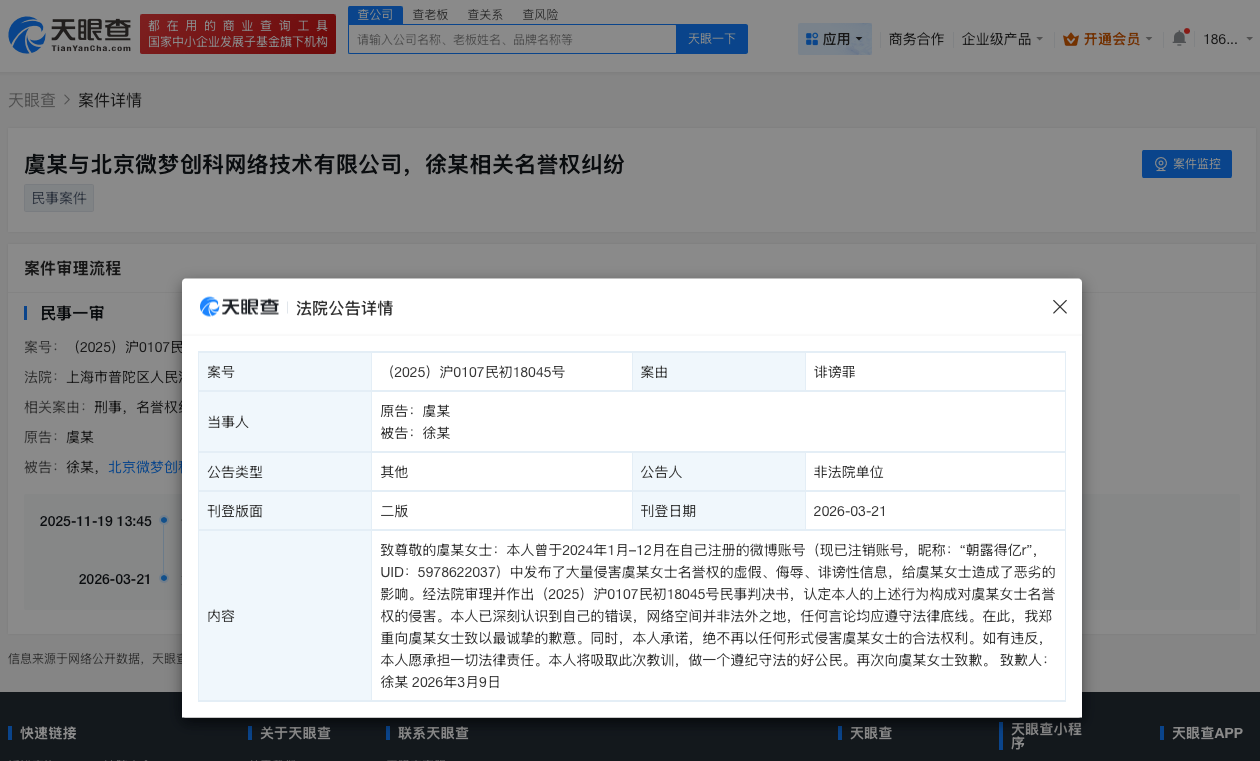 天眼查天眼风险信息显示,3月21日,法院刊登徐某向虞书欣致歉的声明。公告显示,其在微博账号中发布了大量侵害虞书欣女士名誉权的虚假、侮辱、诽谤性信息,给虞书欣女士造成了恶劣的影响。其已深刻认识到自己的错误,郑重向虞书欣女士致以最诚挚的歉意。