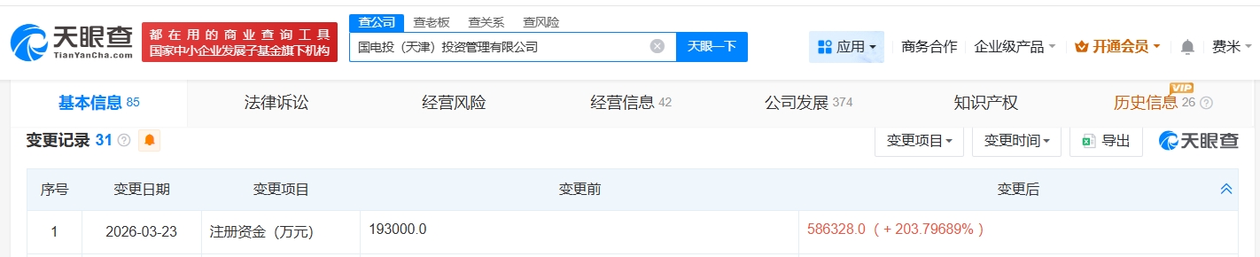 天眼查App显示,近日,国电投(天津)投资管理有限公司发生工商变更,注册资本由19.3亿人民币增至约58.6亿人民币,增幅约204%。