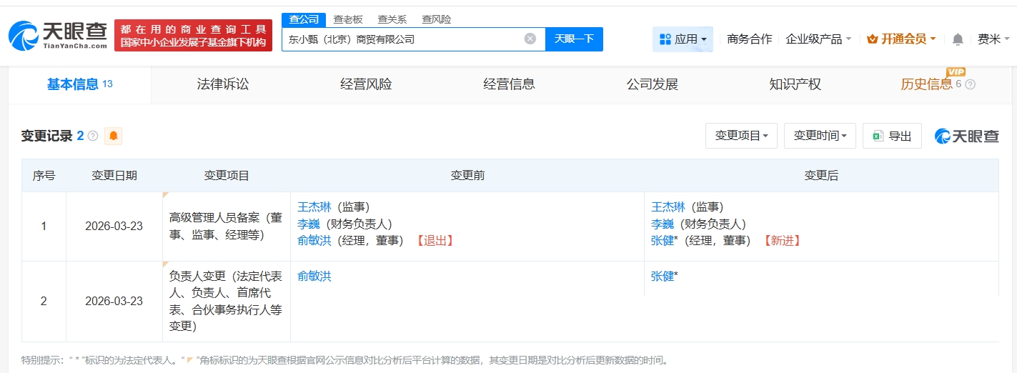 天眼查App显示,近日,东小甄(北京)商贸有限公司发生工商变更,俞敏洪卸任法定代表人、董事、经理,由张健接任。