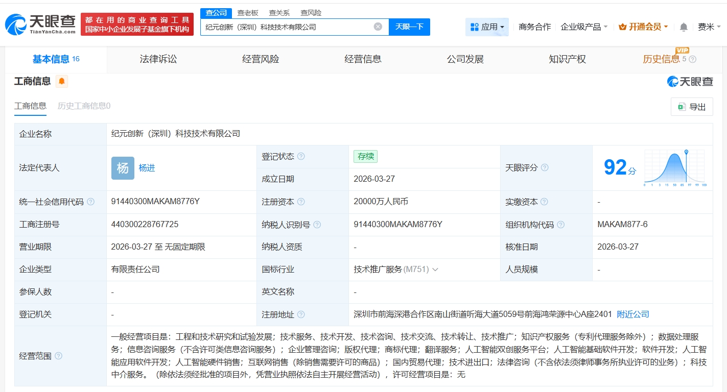 天眼查App显示,3月27日,纪元创新(深圳)科技技术有限公司成立,法定代表人为杨进,注册资本2亿人民币,经营范围包括工程和技术研究和试验发展、人工智能基础软件开发、人工智能应用软件开发等,由TCL科技(000100)、TCL王牌电器(惠州)有限公司、嘉藤(深圳)投资控股有限公司、嘉藤众励投资(深圳)合伙企业(有限合伙)共同持股。