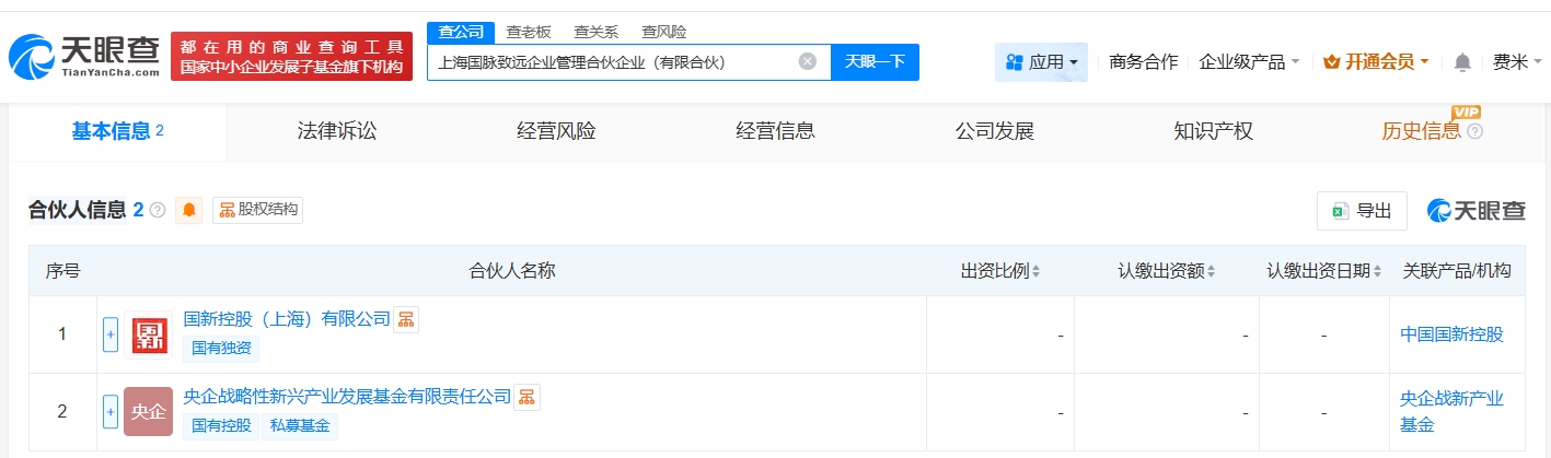 天眼查App显示,4月10日,上海国脉致远企业管理合伙企业(有限合伙)成立,执行事务合伙人为国新控股(上海)有限公司,出资额2.02亿人民币,经营范围包括企业管理、企业管理咨询、会议及展览服务等。合伙人信息显示,该合伙企业由国新控股(上海)有限公司、央企战略性新兴产业发展基金有限责任公司共同出资。