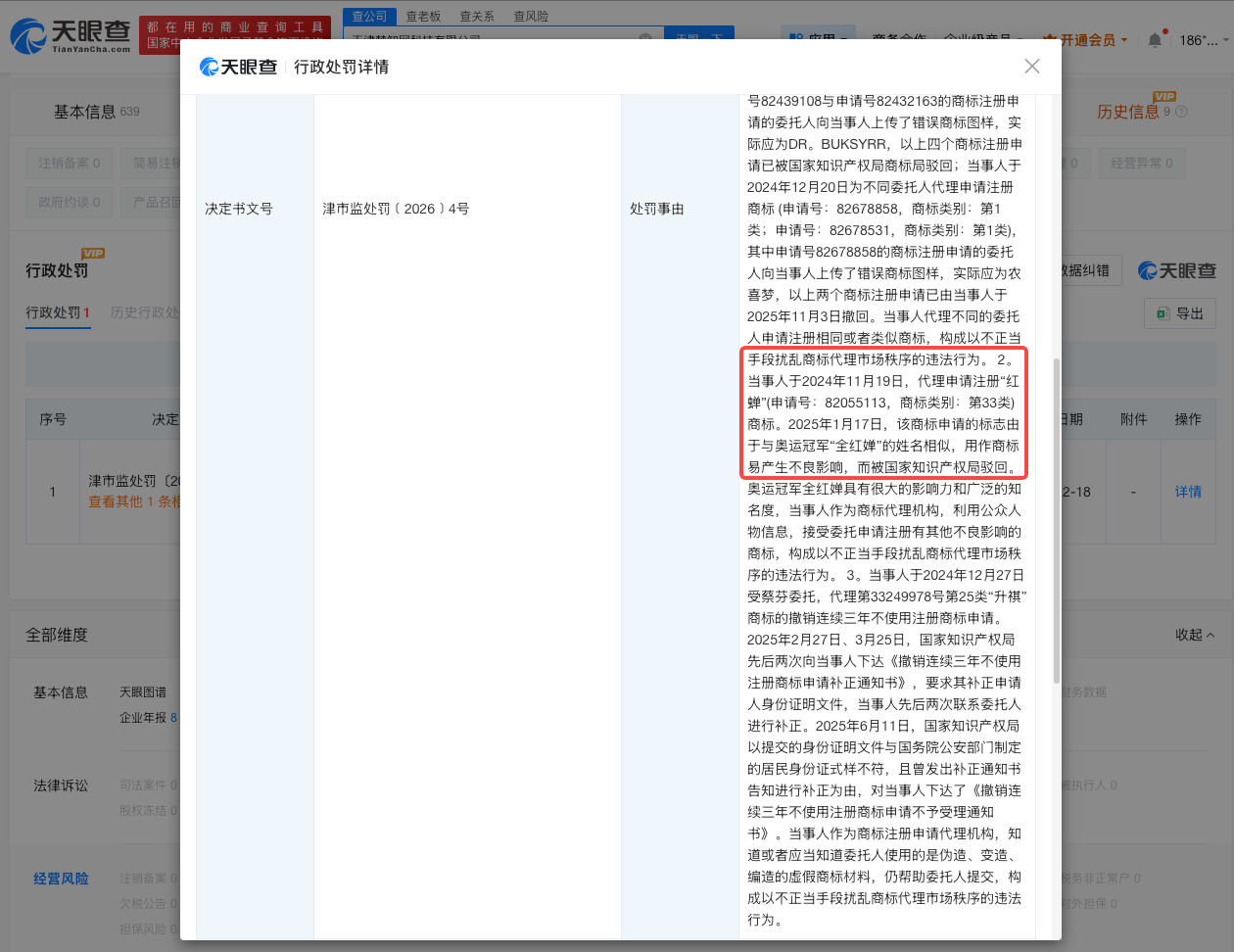 天眼查App显示,2025年12月,天津某科技有限公司因以不正当手段扰乱商标代理市场秩序,被天津市市场监督管理委员会罚款1万元。违法事实显示,当事人代理申请注册“红蝉”商标。因该商标申请的标志与奥运冠军“全红婵”的姓名相似,用作商标易产生不良影响,而被国家知识产权局驳回。当事人作为商标代理机构,构成以不正当手段扰乱商标代理市场秩序的违法行为。此外,多家公司曾因申请“全红婵”相关商标被罚。