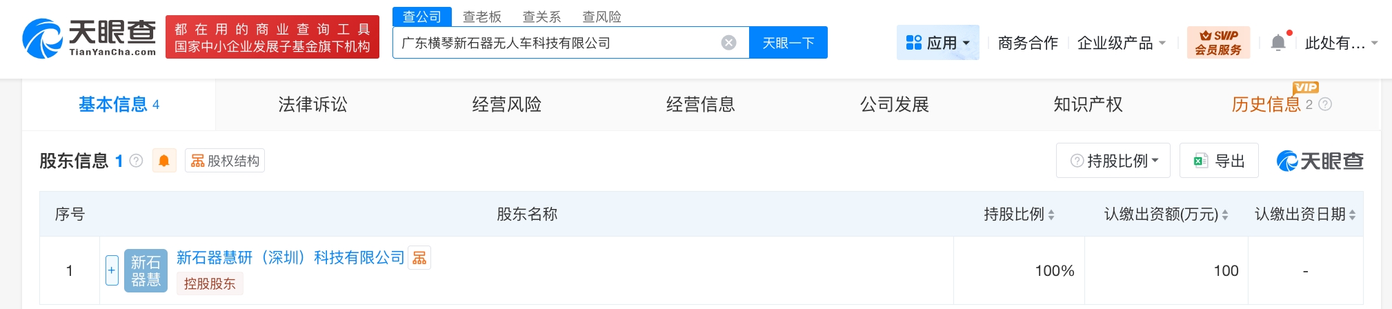 天眼查工商信息显示,近日,广东横琴新石器无人车科技有限公司成立,法定代表人为李子夷,注册资本100万人民币,经营范围包括智能机器人的研发、汽车零部件研发、外卖递送服务等。股东信息显示,该公司由新石器无人车旗下新石器慧研(深圳)科技有限公司全资持股。