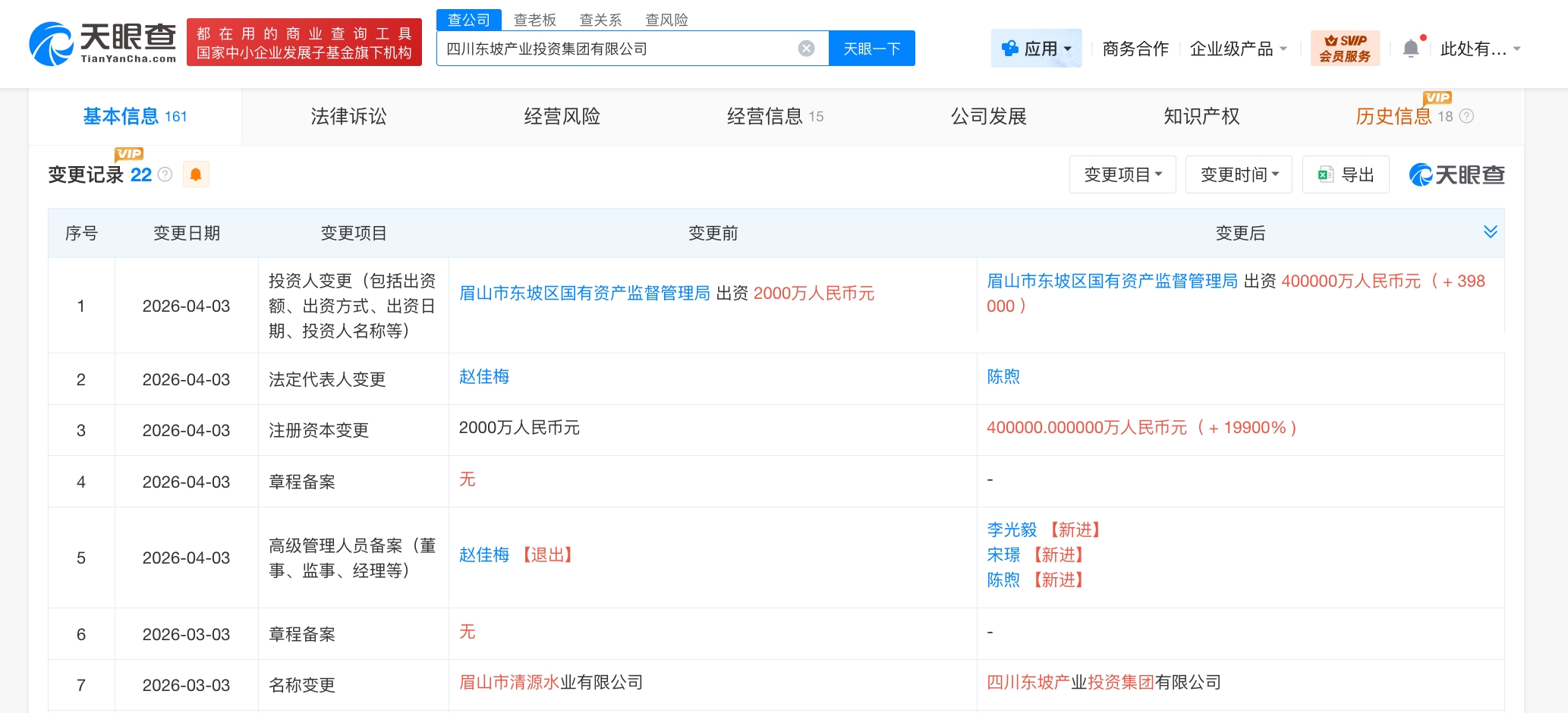 天眼查App显示,近日,四川东坡产业投资集团有限公司发生工商变更,注册资本由2000万人民币增至40亿人民币,增幅19900%。同时,赵佳梅卸任法定代表人,由陈煦接任。