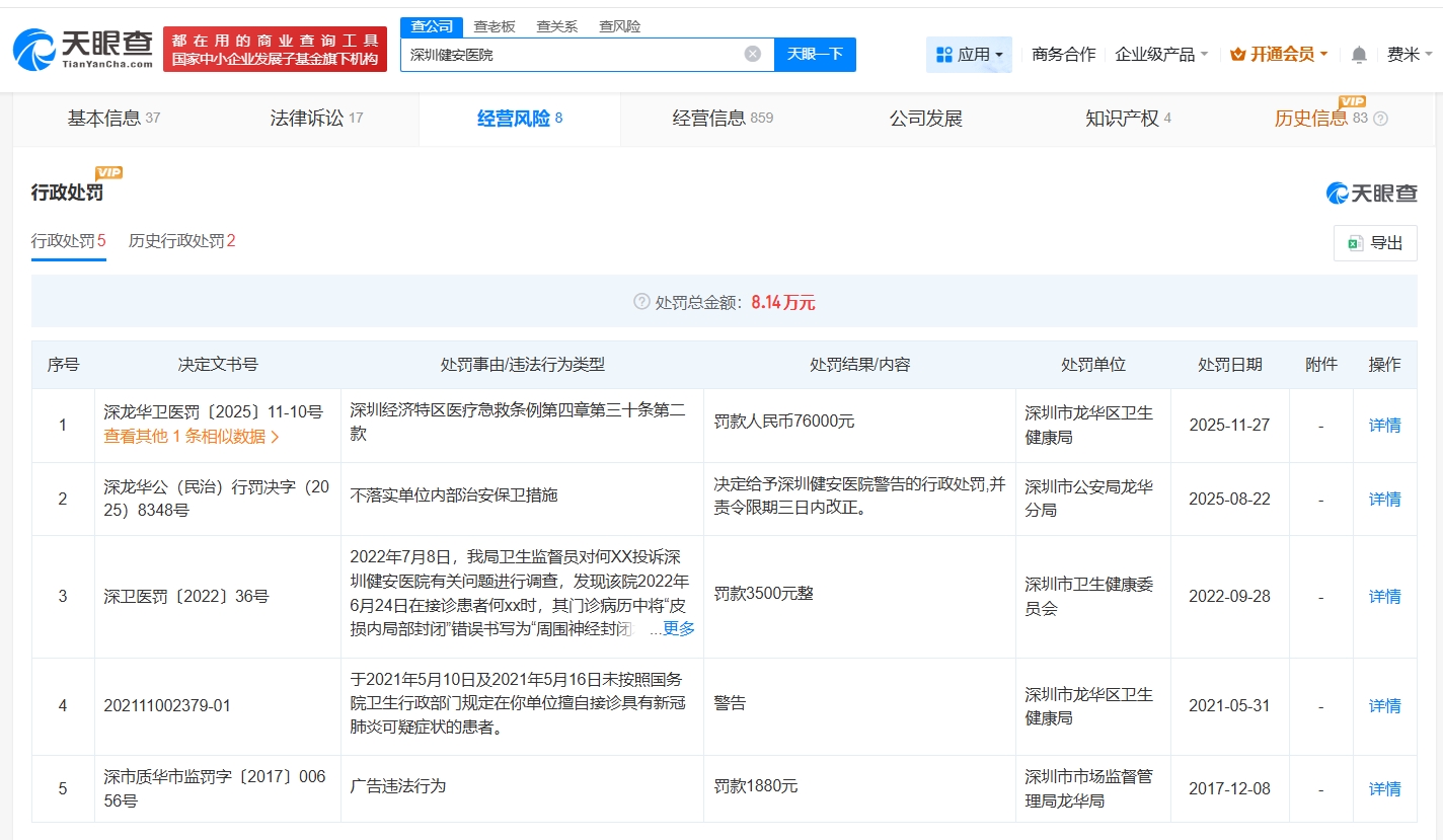 天眼查App显示,深圳健安医院成立于2016年1月,法定代表人为吴秀香,注册资本300万人民币,经营范围包括中医养生保健服务、中西医诊疗服务、食品销售等,由深圳市国丹医院管理有限公司全资持股。风险信息显示,该医院现存多条行政处罚信息。值得一提的是,去年11月,该医院因未按医疗急救调度指令将患者转运至相应的医院救治,被深圳市龙华区卫生健康局罚款7.6万元。
