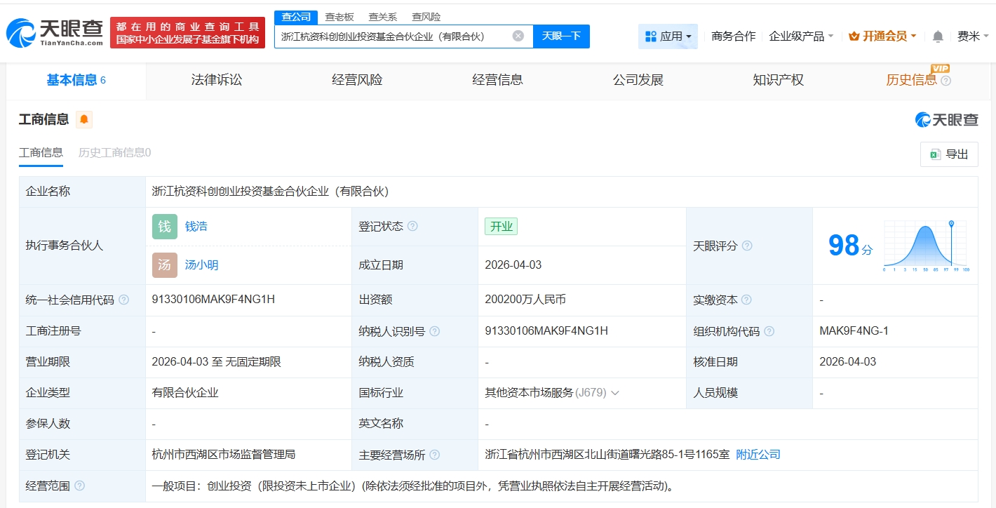 天眼查App显示,近日,浙江杭资科创创业投资基金合伙企业(有限合伙)成立,执行事务合伙人为钱浩、汤小明,出资额20.02亿人民币,经营范围为创业投资。合伙人信息显示,该基金由浙江省创业风险投资引导基金管理有限公司、杭州高科技创业投资管理有限公司、杭州西湖产业基金有限公司、杭州国舜股权投资有限公司、浙江省创新科技私募基金管理有限公司共同出资。