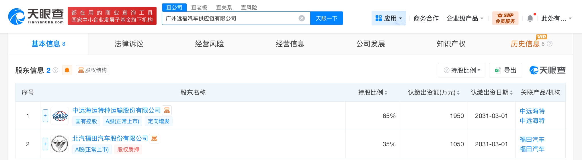 天眼查工商信息显示,近日,广州远福汽车供应链有限公司成立,法定代表人为杜笑天,注册资本3000万人民币,经营范围包括供应链管理服务、国际货物运输代理、无船承运业务、从事国际集装箱船、普通货船运输等。股东信息显示,该公司由中远海特(600428)、福田汽车(600166)分别持股65%、35%。