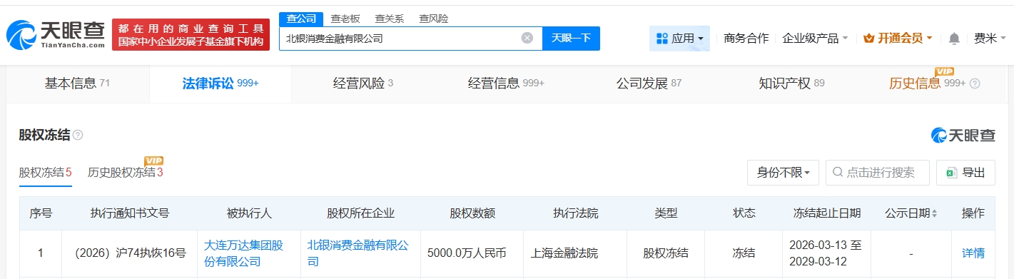 天眼查App显示,北银消费金融有限公司新增一则股权冻结信息,被执行人为大连万达集团股份有限公司,冻结股权数额5000万元,冻结期限为3年,执行法院为上海金融法院。