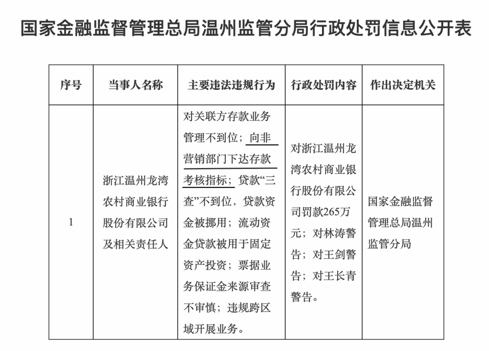 比如,今年7月,浙江温州龙湾农商行因对关联方存款业务管理不到位、向非营销部门下达存款考核指标以及贷款“三查”不到位等多项案由,被监管处以罚款265万元。