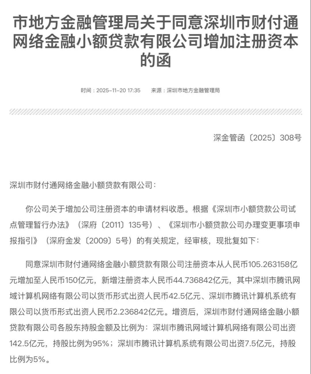 深圳市地方金融监管局批复显示,腾讯旗下财付通网络金融小额贷款有限公司(以下简称“财付通小贷”注册资本由105.26亿元增至150亿元,增幅超42%。