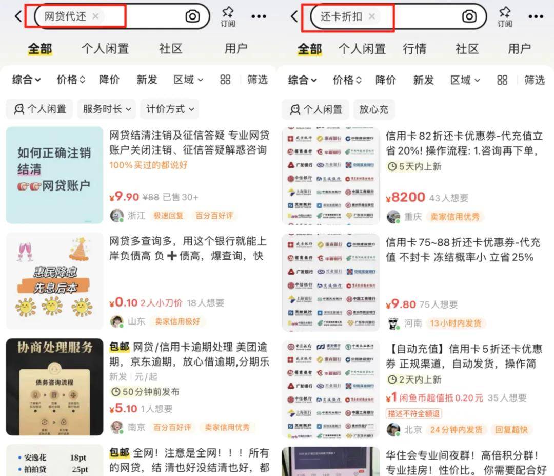 相比之下,“网贷代还”的灰产,隐蔽性及迷惑性都更强。而且,与前两类大多活跃于社交媒体、短视频平台截然不同,网贷代还通常混迹于闲鱼等二手交易平台。