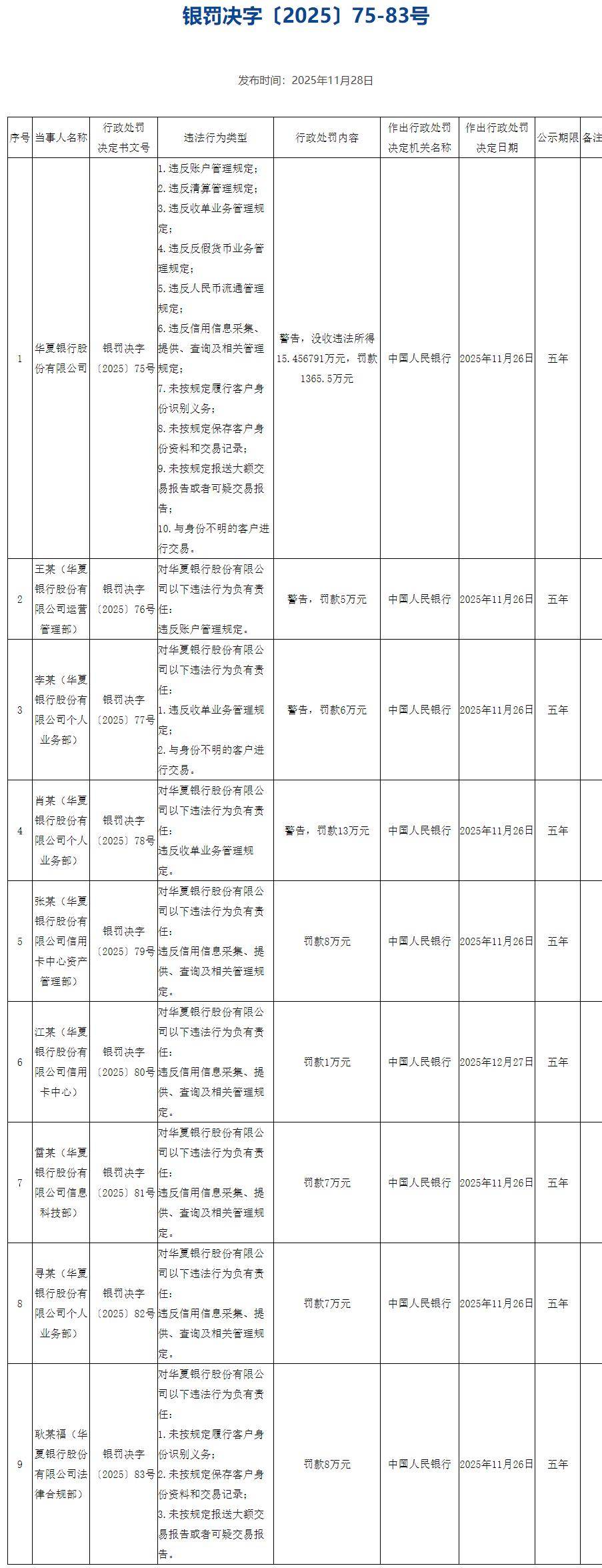 11月28日,央行官网披露的行政处罚信息显示,因为存在违反账户管理规定;违反清算管理规定;违反收单业务管理规定;违反反假货币业务管理规定等十项违法违规行为,华夏银行被予以警告,没收违法所得15.456791万元,并处以1365.5万元罚款,合计罚没金额高达1380.96万元。