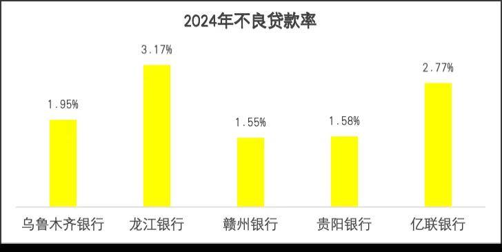 值得注意到,前文提到的乌鲁木齐银行、龙江银行、赣州银行、贵阳银行、亿联银行,本身不良贷款率都不低,2024年分别为1.95%、3.17%、1.55%、1.58%、2.77%。