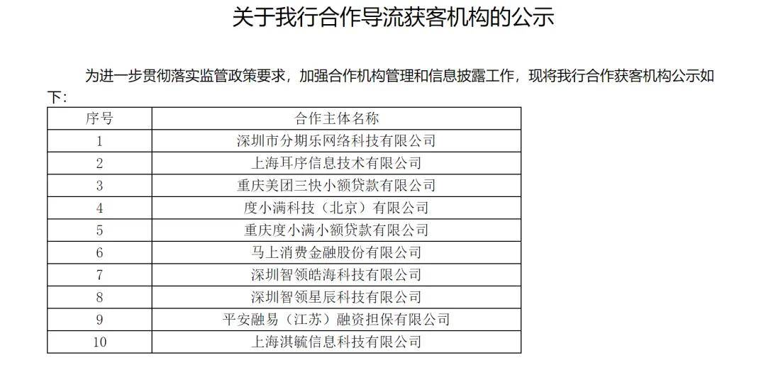 从其9月中旬贴出的获客导流机构公告来看,亿联银行的“搭子”只剩10家,主要为与字节、美团、百度、信也等巨头关联的助贷平台,比如字节旗下的智领皓海和智领星辰,百度旗下的度小满,乐信旗下的分期乐等;从数量来看,相较6月份的53家,这次的名单精减了43家,“瘦身”幅度超80%。