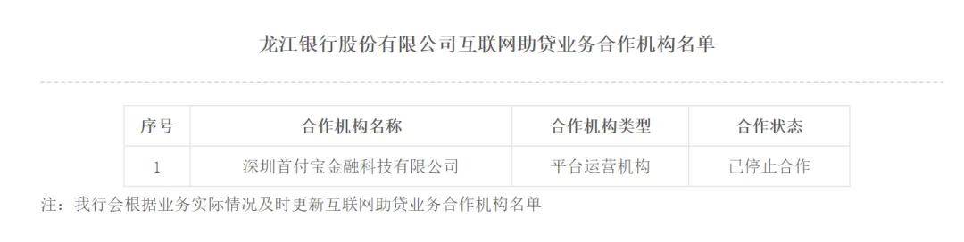 龙江银行公布的最新互联网助贷业务合作机构名单中,仅剩深圳首付宝金融科技有限公司一颗“独苗”,且处于“已停止合作”状态。