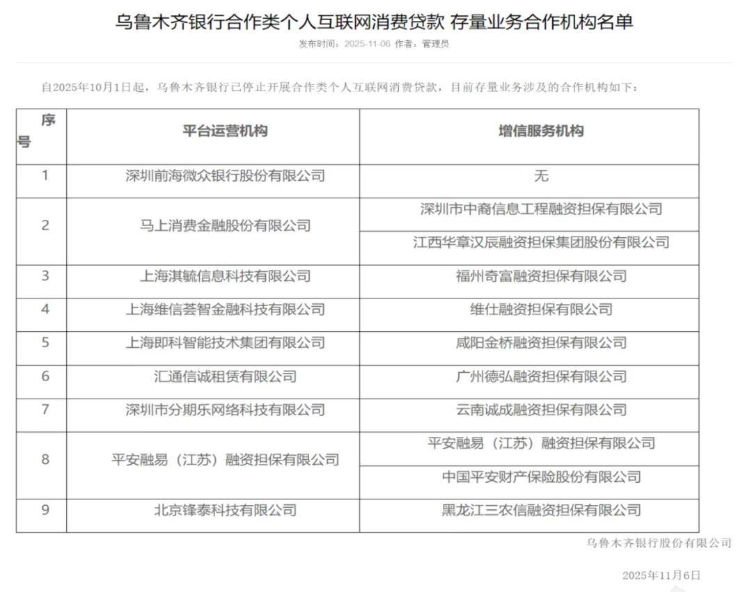 11月初,乌鲁木齐银行在官网公示了当前存量业务所涉及的合作机构名单,并宣布自2025年10月1日起,已全面停止开展合作类个人互联网消费贷款业务。