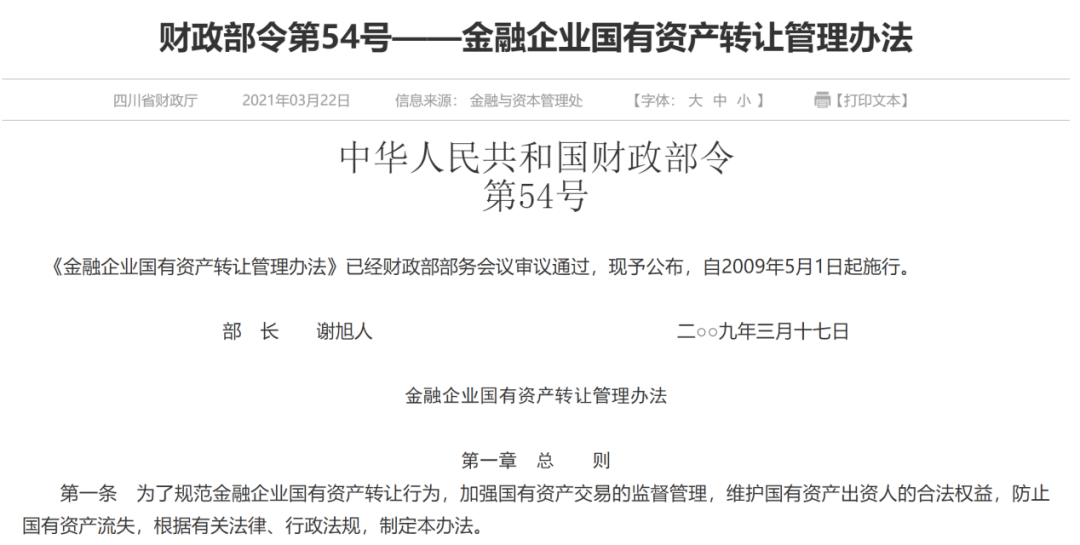 把镜头拉回到全球金融危机后的2009年。为深化国资改革,规范不良处置,缓解企业融资难等,财政部在当年3月出台《金融企业国有资产转让管理办法》(财政部令第54号)。