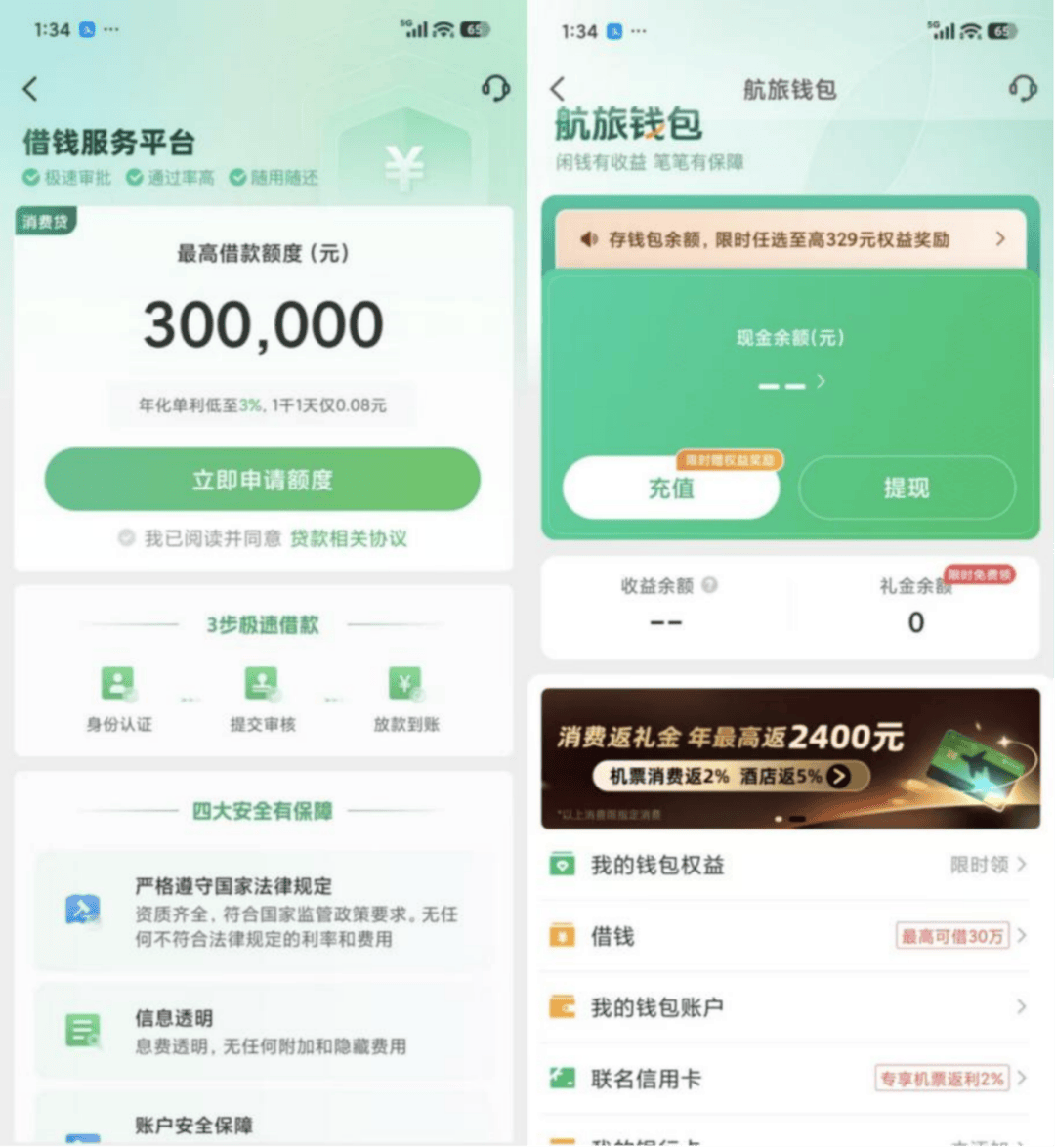 近期,柒财经注意到,出行移动产品——航旅纵横App悄然上线“借钱服务”。通过“我的钱包”进入,显示最高可借款30万元,年化利率低至3%,1千1天仅0.08元,合作机构包括南银法巴消金、百信银行等四家。