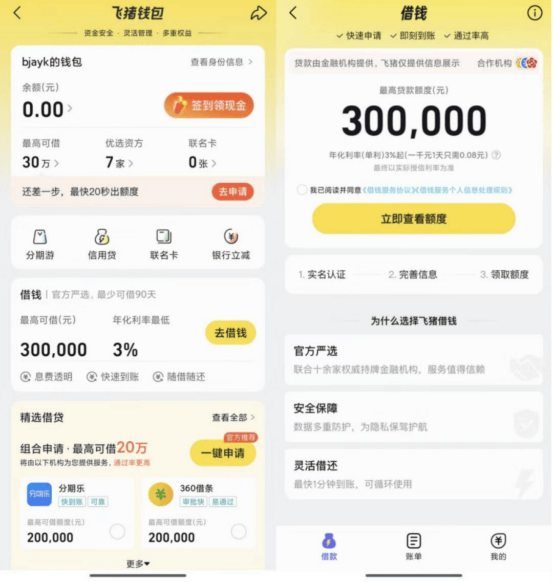 相较老牌的携程、同程旅行,近两年崛起的新秀——阿里生态里的飞猪旅行动作生猛、激进,其合作十余家资方,为用户提供借钱、贷超、车抵贷、房抵贷、分期游、联名信用卡申请等全方位的金融服务。
