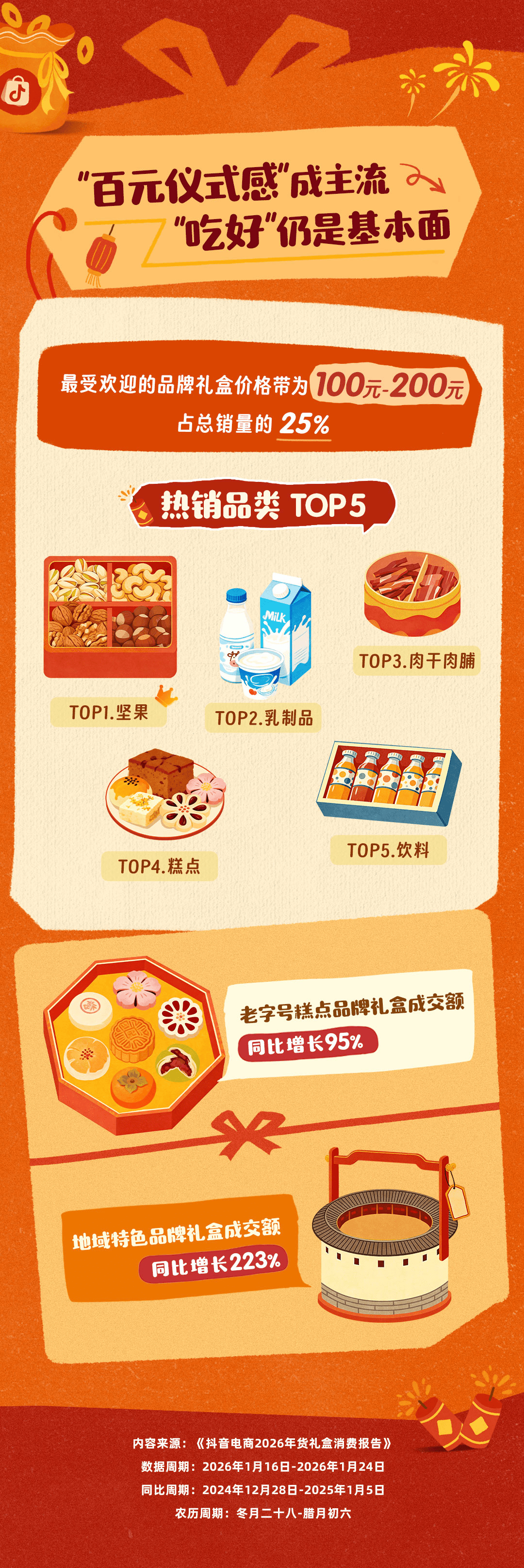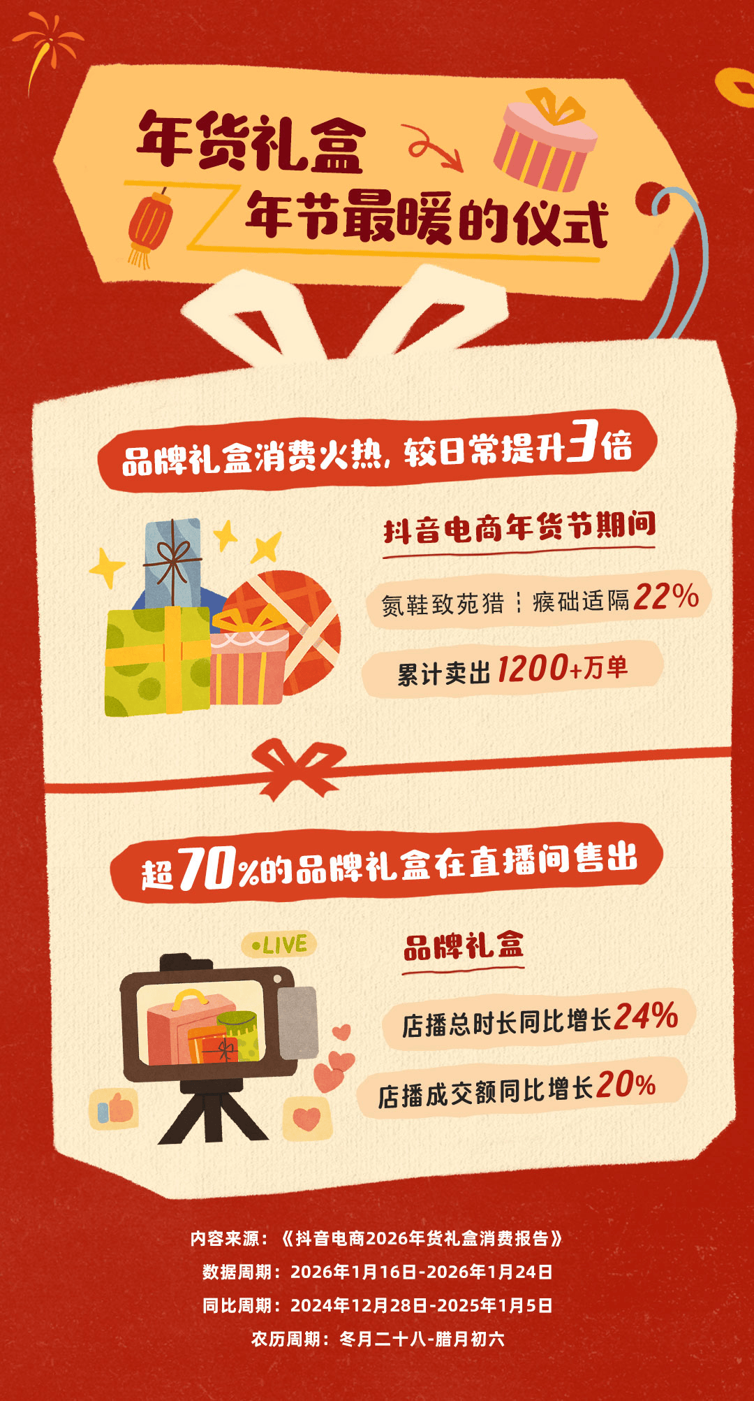 春节临近,年货采购进入消费高峰期,礼盒作为走亲访友、家庭团聚的必备品,迎来消费热潮。《抖音电商2026年货礼盒消费报告》(以下简称“报告”)显示,抖音电商年货节期间,品牌年货礼盒销量较日常提升3倍,其中超过70%的礼盒通过直播间售出,直播电商已成为推动年货礼盒销售增长的主要渠道。
