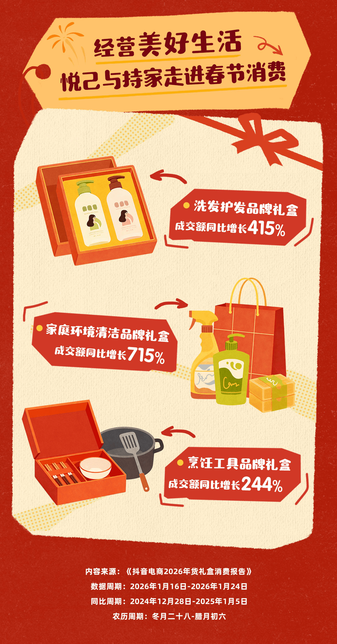 消费者的年货选择正从“吃得好”延伸至“过得好”。报告显示,洗发护发、家庭环境清洁类品牌礼盒成交额分别大幅增长415%和715%,烹饪工具品牌礼盒增长244%。同时,象征吉祥如意的摆件品牌礼盒成交额同比增长278%。兼具“悦己”与“持家”属性的实用型礼盒,成为今年春节消费新趋势。
