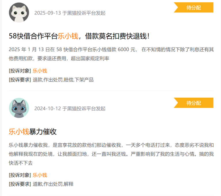 黑猫投诉上,有用户反映“乐小钱”存在莫名扣费、暴力催收、担保费过高等问题。