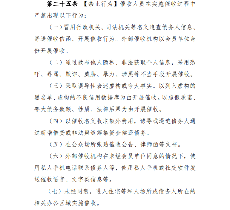 另外,《指引》严禁催收人员出现冒用行政机关名义、恐吓辱骂、散布他人隐私、虚构或夸大事实、诱导或逼迫债务人通过新增借贷或非法渠道筹集资金偿还债务、擅闯私宅等八大类违规行为,旨在从源头上遏制暴力催收、不当催收等乱象,推动行为走向规范、合法、人性化的轨道。