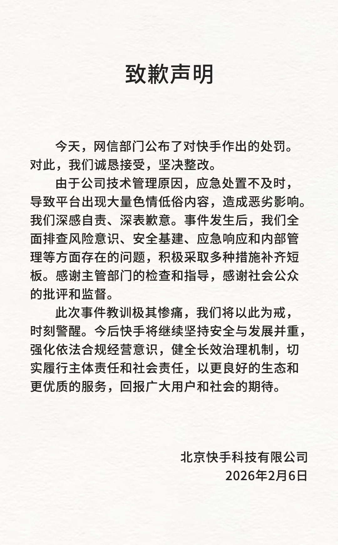 2月6日,北京市互联网信息办公室依据《中华人民共和国网络安全法》《中华人民共和国行政处罚法》相关规定,对快手作出行政处罚决定:给予警告处分,并处1.191亿元人民币罚款;同时责令平台限期完成全面整改,依法依规处置相关违规账号,并对相关责任人从严追责。