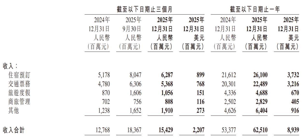 划分业务板块,住宿预定收入261亿元、交通票务收入224.89亿元、旅游度假收入46.88亿元、商旅管理收入28.29亿元,其他收入64.04亿元,相较2024年,全部上行加速,增速分别为20.77%、10.78%、8.12%、13.07%、38.43%。