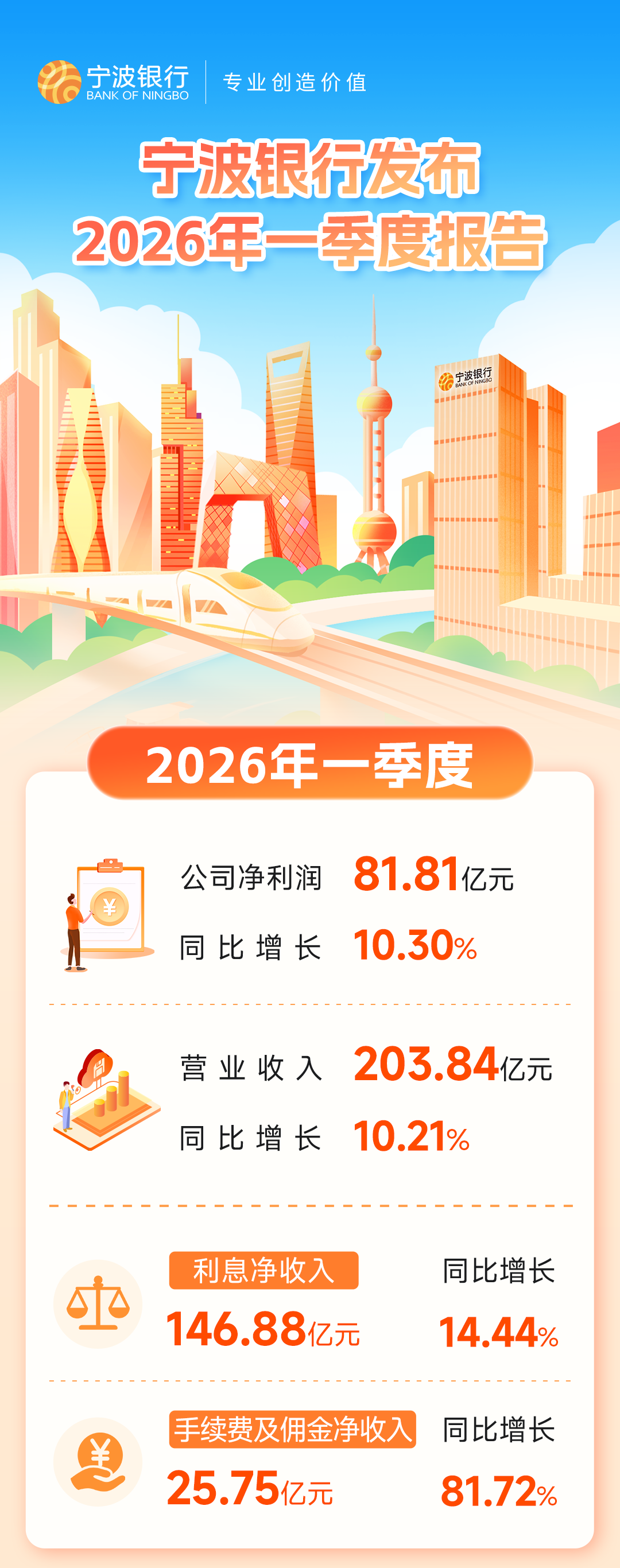 2026年,宁波银行始终坚持以客户为中心,以服务实体经济为己任,持续深化商业模式创新,依托科技赋能提升服务效能,积极拓展多元化盈利渠道,综合化服务能力稳步增强,推动盈利实现稳健增长。