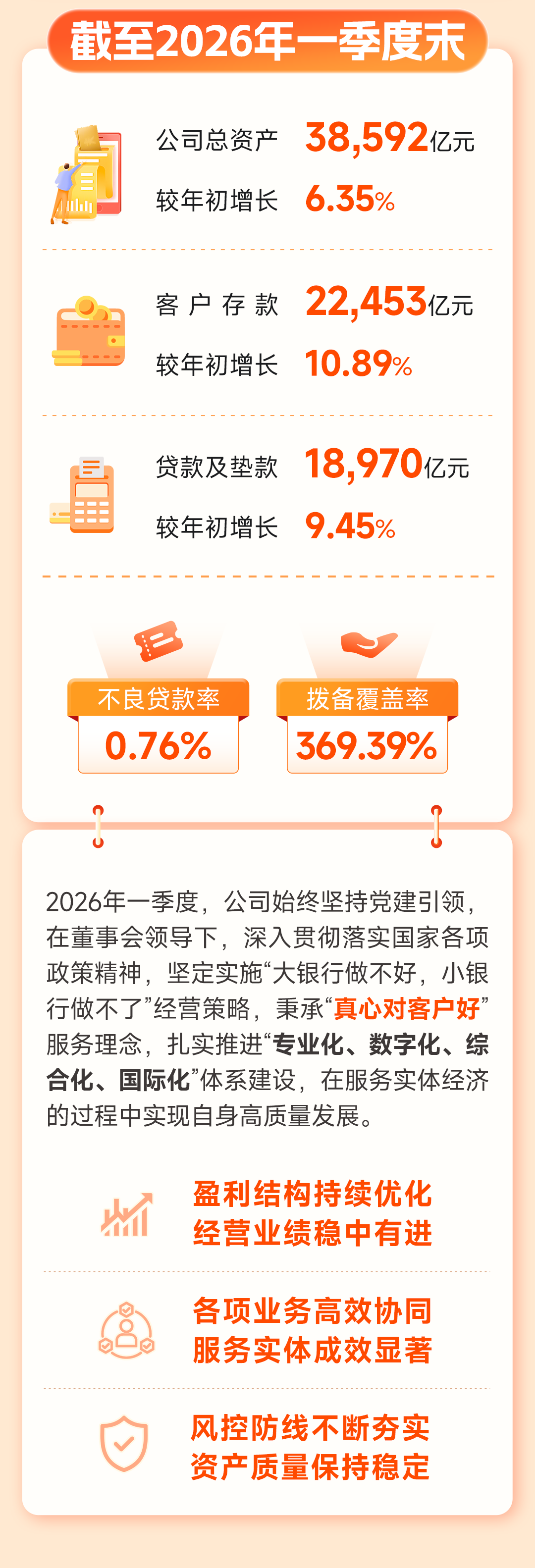 截至2026年3月末,宁波银行资产总额38,592.25亿元,较年初增长6.35%;贷款及垫款18,970.45亿元,较年初增长9.45%;客户存款22,453.06亿元,较年初增长10.89%。